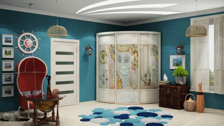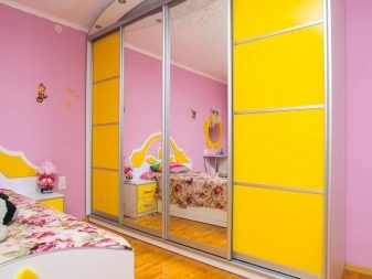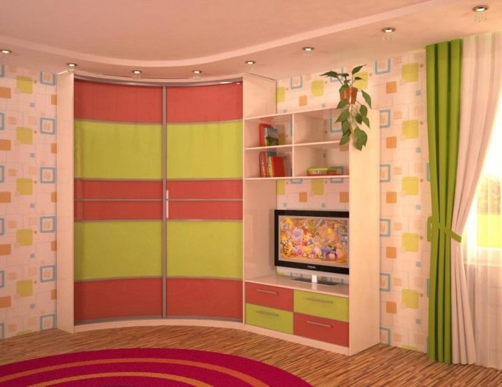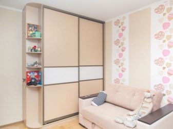 - مشطوف أو نصف قطري. ستكون هذه النماذج ، ذات الواجهة نصف الدائرية ، حلاً مثيرًا للاهتمام وغير عادي ويتم اختيارها لكل من الغرف الفسيحة والصغيرة. المساحة الداخلية لهذه الخزانات أكثر اتساعًا ، ويمكن بسهولة استيعاب كل ما يحتاجه الطفل. في الهياكل الكبيرة ، يجدر الاهتمام بالإضاءة الداخلية ؛ العديد من المصابيح المدمجة مناسبة تمامًا. يمكن تحقيق المزيد من الوظائف من خلال وضع خزانة نصف قطرها في زاوية الغرفة. هذا التصميم مثالي لغرفة الأطفال ، حيث لا توجد زوايا حادة على الإطلاق..