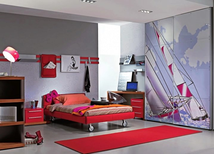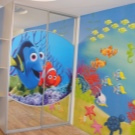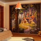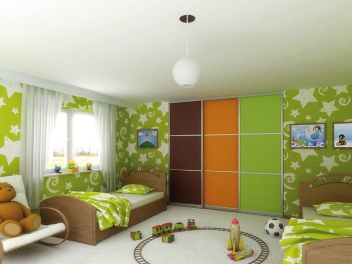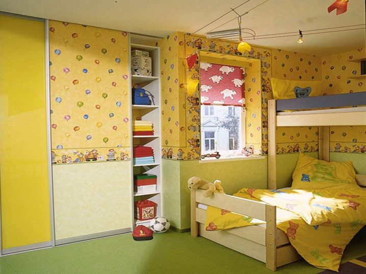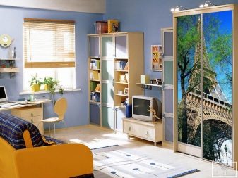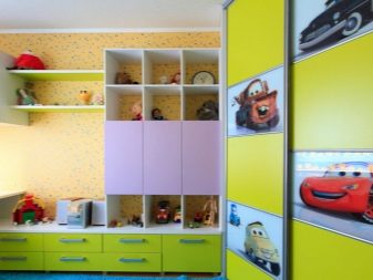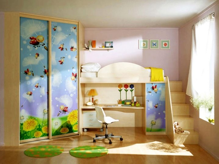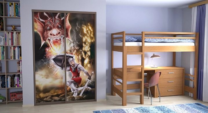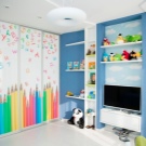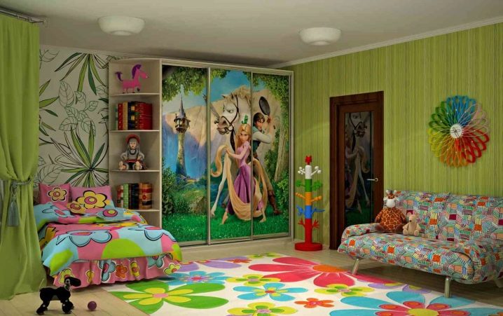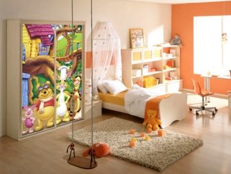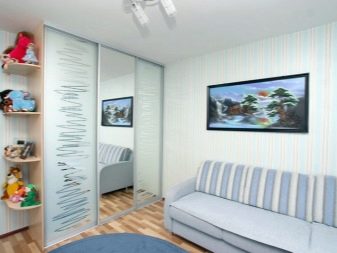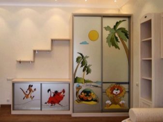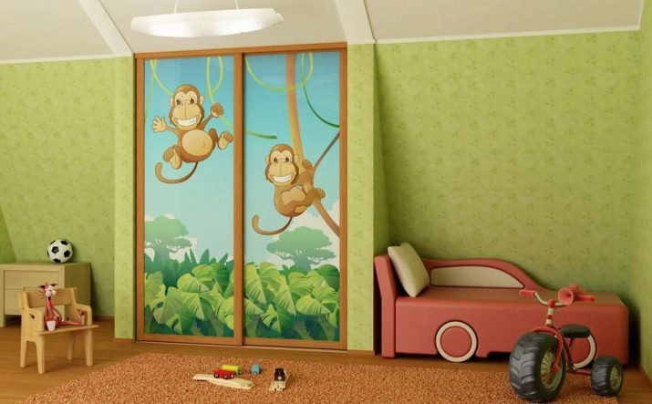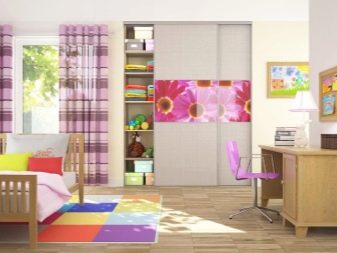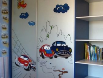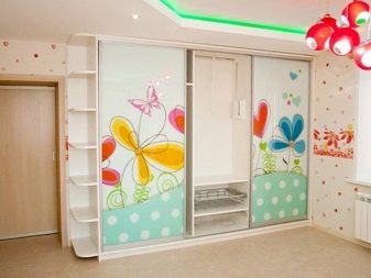 يمكن أن تصبح الواجهة المنزلقة للخزانة زخرفة داخلية ، يكفي اختيار التصميم المناسب. تبدو الهياكل المصنوعة من الخشب والبلاستيك بنمط مطبوع رائعة. صورة كبيرة لشخصيات الرسوم المتحركة المفضلة لديك أو المناظر الطبيعية الرائعة الملونة ستسعد أي طفل. لن يكون تركيب الأبواب بالزجاج أو المرآة هو الحل الأفضل ، خاصة في الغرفة التي ينمو فيها طفل ما قبل المدرسة..
