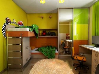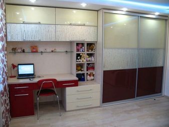 - وظائف. إذا نشأ طفلان في نفس الغرفة وكانت المساحة صغيرة ، يمكن تثبيت المنطقة الوظيفية للمكتب أو مكتب الكمبيوتر في خزانة الملابس. يمكن ملء المساحة العلوية المتبقية بأرفف الكتب ، وفوق سطح العمل ، تأكد من تثبيت الإضاءة على شكل مصابيح مدمجة أو مصباح طاولة. إذا لزم الأمر ، يمكن إخفاء هذه المنطقة بلوحة تسحب للخارج.