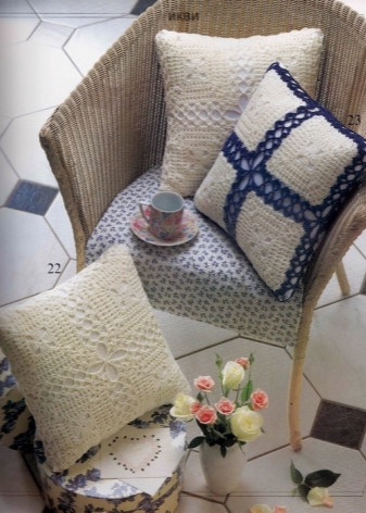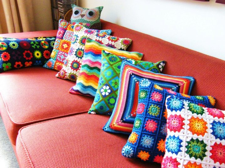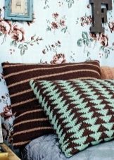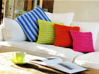 الوسائد ، محبوكة بتقنيات مختلفة ، تزين وتزين أي مكان. يمكن استكمالها مع pom-poms ، الدانتيل ، زين ، الأقواس ، تطريز الشريط. يمكن حياكة المنتجات من مربعات متعددة الألوان باستخدام تقنية الترقيع.