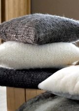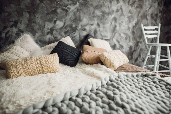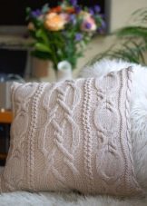 اليوم ، أصبحت الأنماط الكلاسيكية والضفائر وشدات الورد والأزرار رائجة. أي نظام ألوان ، ولكن ظلال الأبيض والعاجي ستكون خيارًا يربح فيه الجميع. الوسائد المنزلية المحبوكة تبدو رائعة في الكراسي القديمة المفضلة لديك. في بعض الأحيان يزين المصممون الزاوية الناعمة بالكامل في الداخل بالغزل..