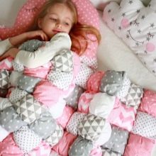 - ديكور “لعبة” – مجموعة خاصة من البطانيات المصنوعة يدويًا للأطفال ، والتي يمكن أن تصبح حصيرة اللعب الأولى التي تطور المهارات الحركية للأطفال (إضافة أشياء مختلفة إلى سطح شرشف السرير مع تثبيتها).