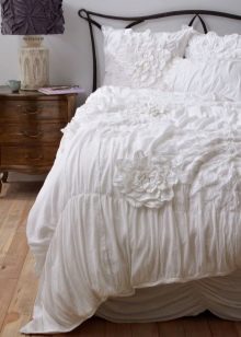 يكمن تفرد العناصر الزخرفية لمفارش الأسرة هذه في حقيقة أنه في معظم الحالات يتم دمجها تمامًا مع بعضها البعض (على سبيل المثال ، حواف عريضة حول المحيط بغرزة) ، مما يتيح لك التأكيد بشكل مناسب على نسيج المادة ، قم بتمييز منطقة معينة من غطاء السرير ، وحدد الحواف الجانبية للأثاث (انتفاخات ، وكشكشة ، وزهور متعددة الطبقات).