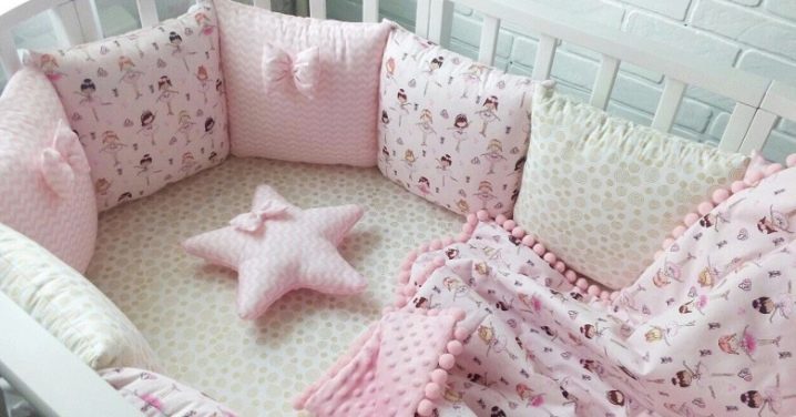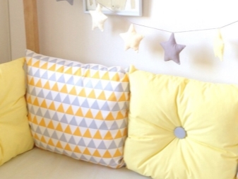 يمكنك تنويع تصميم سرير الأطفال ليس فقط بأشكال مثيرة للاهتمام ، ولكن أيضًا بخيالك. تستطيع العديد من الأمهات صنع وسادات أصلية بأيديهن. سوف يساعدك التطريز وأفكارك الخاصة في ذلك. هذا الخيار فردي ويجذب انتباه العديد من الإبر..