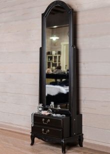 يمكن تركيب مرآة مع رف بطرق مختلفة. يمكن توصيله. يحتوي هذا التصميم على خزانات ورفوف صغيرة في الأسفل ويتم وضعها على الأرض. لا يحتاج هذا العنصر إلى التثبيت على الحائط ، فهو مستقر تمامًا من تلقاء نفسه.