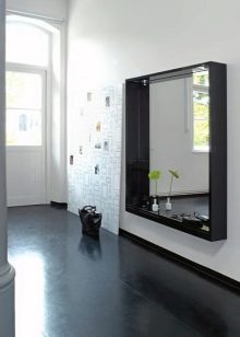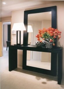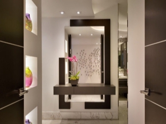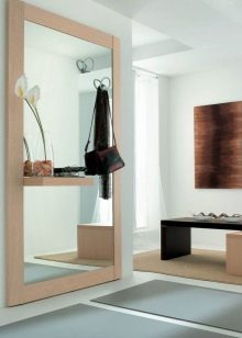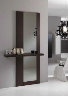 إذا كان المدخل الخاص بك يحتوي على جدران لامعة ، فأنت بحاجة إلى اختيار مواد ناعمة للرف والإطار. في الردهة الفسيحة والمشرقة ، ستبدو المرآة في إطار مصنوع من نفس ورقة المرآة مع رف زجاجي جيدًا. لإضفاء صلابة على المدخل ، يجب عليك استخدام إطار ضخم مصنوع من الخشب الطبيعي..