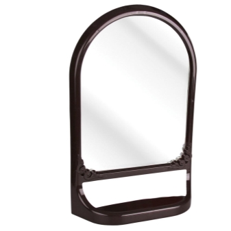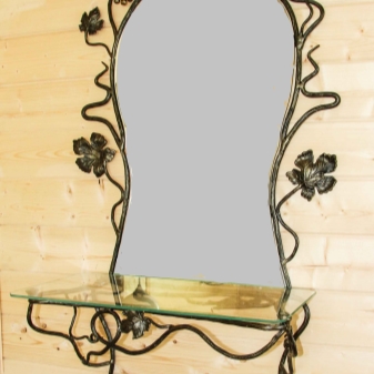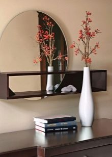 تأتي المرآة ذات الرف بعدة أشكال ويمكن أن يكون لها أشكال مختلفة. أبسط منتج مستطيل ، يوجد أسفله رف للأشياء الصغيرة. السمة البيضاوية في المرتبة الثانية من حيث الشعبية. يأتي هذا العنصر بأشكال خيالية مختلفة..