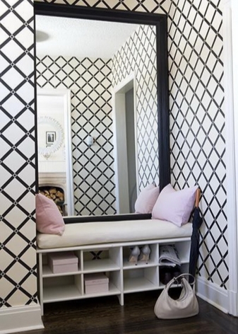 غالبًا ما يستخدم المصممون رفًا مرآة عند تزيين الرواق.