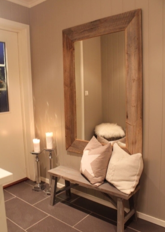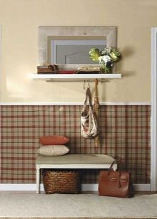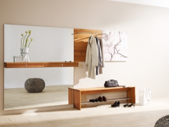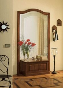 مرآة ذات هيكل مفصلي في إطار خشبي ورف ، يتم تنفيذ وظيفتها بواسطة مقعد عادي. تبدو مثيرة للاهتمام ، على الرغم من بساطة المجموعة. مثالية لرواق على الطراز الريفي.