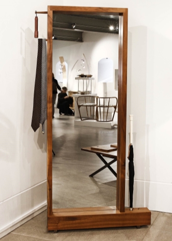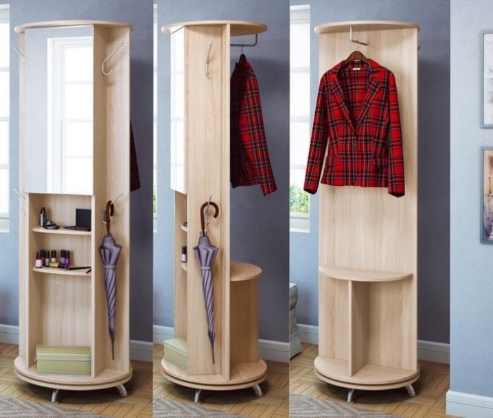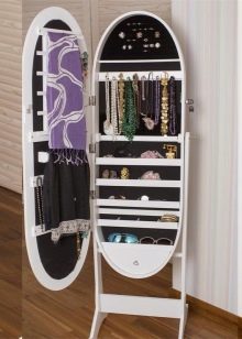 مرآة بأرفف مثبتة على قاعدة دوارة. بقلبها رأسًا على عقب ، ستجد علاقات وخطافات للإكسسوارات. شيء مناسب للممرات الصغيرة.