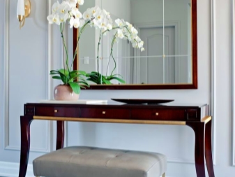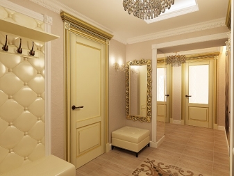 إذا كان المدخل الخاص بك مصنوعًا بأسلوب فاخر وأرستقراطي ، فستظهر بشكل أفضل وسادة باهظة الثمن مع تقليم من الجلد الأصلي. على سبيل المثال ، في غرفة أرستقراطية بجدران بيج وأرضية بنية شاحبة ، يمكنك وضع عثماني مربع صغير مصنوع من جلد حليبي ، وتعليق مرآة بإطار باغيت فوقه ، ووضع رف مع علاقات بعيدًا قليلاً ، مزينًا مع جدار خلفي مصنوع من جلد كريمي مبطن.