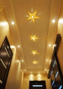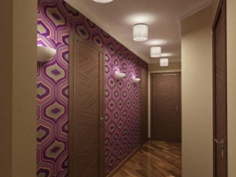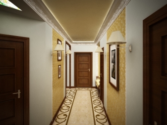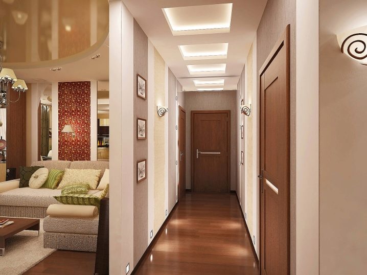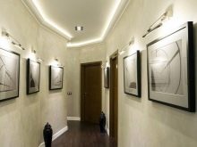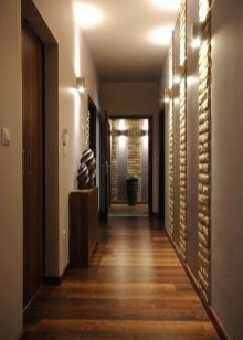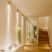 من الأفضل اختيار لون أفتح من مخطط ألوان الجدران ، الخيار الشائع هو الأبيض. مصابيح السقف المعلقة هي خيار جيد, توضع على طول الرواق بالكامل. للراحة ، يمكنك عمل مفتاحين لمنطقتين وظيفيتين أو تثبيت مستشعر حركة عند المدخل.