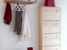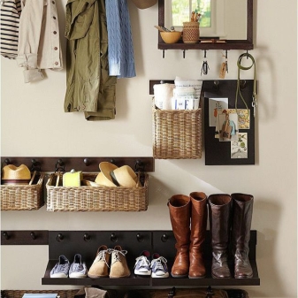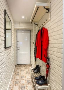 إذا كانت المساحة ضيقة جدًا ، فتخلص من الخزانة واحصل على علاقة معاطف. يجب أن يكون عدد قليل من خطافات الحائط كافياً. يعد رف الأحذية أيضًا من بين الأساسيات في الممر. يمكن وضعها تحت علاقة. لتوفير مساحة ، من المناسب دمج خزانة الأحذية بمقعد.
