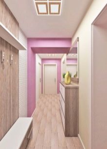 - التقسيم. يمكن تقسيم الممر إلى منطقتين وظيفيتين: المدخل والممر الفعلي واللوبي. تتميز بمواد وألوان مختلفة وأثاث مناسب. على سبيل المثال ، في منطقة المدخل ، يمكنك ترك شماعات للملابس الخارجية ، ورف للأحذية ، ووسادة ، وفي الردهة يمكنك وضع خزانة ذات أدراج ، وحجر رصيف ، ومرآة ، ورفوف للعناصر الزخرفية ، وزخارف الجدران. عند المدخل ، ضع بلاط الأرضية بألوان داكنة وقم بتغطية الباقي ، على سبيل المثال ، بألواح خشبية أو باركيه أو ألوان مختلفة. يمكنك أيضًا استخدام بساط للفصل..