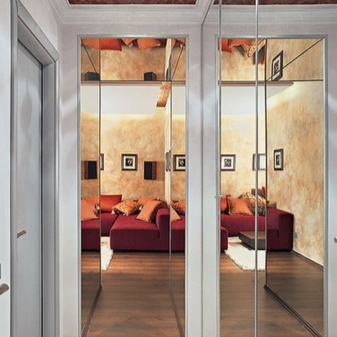 - انعكاس. إنها تلعب دائمًا على التوسع البصري للفضاء. ضع عدة مرايا في الممر ، واجعل أبواب خزانة الملابس معكوسة ، وضع حشوات المرآة في الأبواب ، واستخدم الأسطح اللامعة للأثاث ، والأرضية ، والسقف. يمكنك اختيار أحد الخيارات المدرجة أو الجمع بين عدة خيارات.