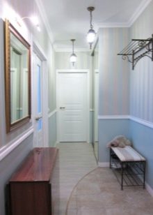 - هناك نظام ألوان مثير للاهتمام يقسم الجدار إلى قسمين أفقيًا باستخدام القوالب. عادة ما يكون الجزء العلوي أخف من القاع. سيساعد هذا الاختيار في التخلص من تأثير النفق لممر طويل. عادة ما يكون الصب أبيض أو يتم اختياره لمطابقة اللون