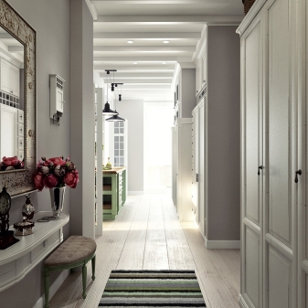 على الرغم من مساحة الغرفة الصغيرة نوعًا ما ، إلا أن هناك العديد من خيارات التصميم لممر ضيق. كل هذا يتوقف على خيالك.