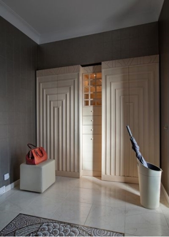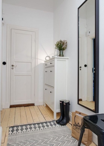 - لا حاجة لترتيب الأثاث بشكل عشوائي في جميع أنحاء المكان, ومع ذلك ، لا يجب تجميع كافة العناصر كبيرة الحجم في مكان واحد أيضًا. يعتبر الخيار الأكثر تناسقًا هو الموقف عندما يتم وضع الأثاث على جدارين متوازيين. لذلك ، على سبيل المثال ، يمكنك وضع خزانة مع مرآة على جانب واحد ، وعلى الجانب الآخر – عثماني أو مقعد ، بالإضافة إلى خزانة أو رف للأحذية أو خزانة أخرى. بادئ ذي بدء ، ستعتمد المفروشات على احتياجاتك..