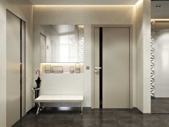 - يمكنك تقسيم الردهة إلى مناطق باستخدام الضوء. لذلك ، على سبيل المثال ، يمكن تمييز المساحة القريبة من المرآة بمصدر صغير ولكنه ساطع يغطي مساحة صغيرة ، ويمكن إنشاء إضاءة منتشرة ناعمة لبقية المساحة..