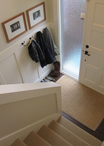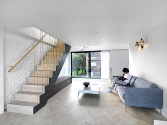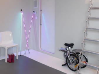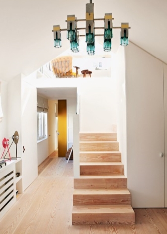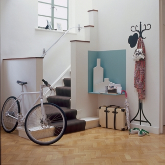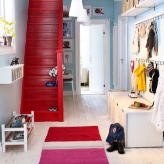 - غالبًا ما تحتوي المنازل على ممرات مع درج إلى الطابق الثاني. إذا كان الممر صغيرًا جدًا ، فقد تكون هذه مشكلة. في هذه الحالة ، يجب أن تحقق أقصى استفادة من المساحة الموجودة أسفل الدرج ، لأنه في بعض الأحيان يمكن وضع خزانة صغيرة هناك لتخزين الأشياء الضرورية. إذا كان الدرج موجودًا في غرفة فسيحة ، فلن تكون هناك مشاكل في الموقف. ومع ذلك ، من المهم أن تتوافق الخطوات في التصميم مع كل من المدخل والغرفة التي تؤدي إليها..