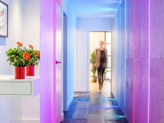 - لممر ضيق طويل من الأفضل اختيار نغمات الحائط الأخف. أيضًا ، سيتطلب مثل هذا التصميم حدًا أدنى من الأثاث حتى لا يتداخل مع المرور. من الأفضل تقييد نفسك بخزانة زاوية صغيرة أو تعليق طابق نصفي لتخزين الأشياء الضرورية. لن تكون المرايا العريضة على طول الجدران غير ضرورية – فهي ليست لها وظيفة عملية فحسب ، بل تتيح لك أيضًا توسيع المساحة بصريًا.