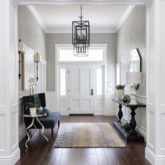 أكثر تعقيدًا وإثارة للاهتمام إلى حد ما ، يمكنك جعل الجزء الداخلي من الرواق متوسط أو كبير الحجم. في مثل هذه المساحة ، يمكنك إضافة العديد من التفاصيل الصغيرة المثيرة للاهتمام ، أو خلق جو بأسلوب كلاسيكي أو إنشاء تصميم داخلي انتقائي أصلي. عرض الرواق مهم أيضًا. إذا كان لديك مساحة ضيقة طويلة ، فمن الصعب أن تسميها فسيحة.. إذا كان المنزل به مدخل كبير مربع أو مستطيل ، فقد تكون مهتمًا بالأفكار التالية: