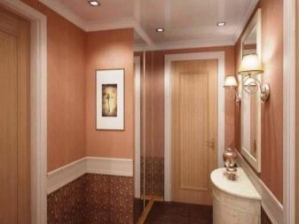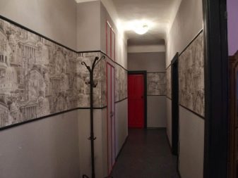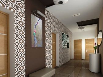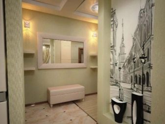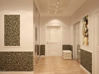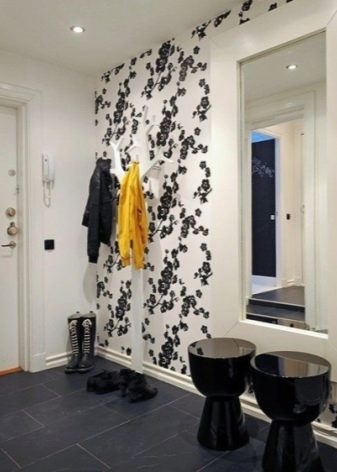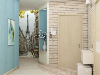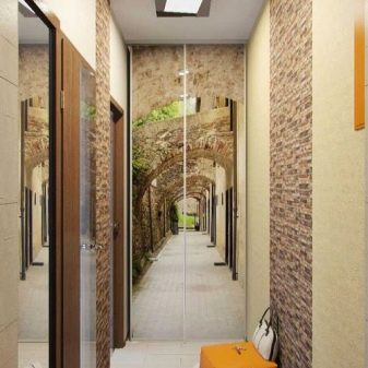 - التأثير البصري. تتيح لك هذه التقنية تفتيح الممر وجعله بصريًا أكثر اتساعًا وزيادة ارتفاع الأسقف وإخفاء المخالفات. من خلال اختيار خلفية الصورة المناسبة بنمط واقعي ، يمكنك حتى إنشاء وهم بمساحة إضافية ومزاج خاص للغرفة..