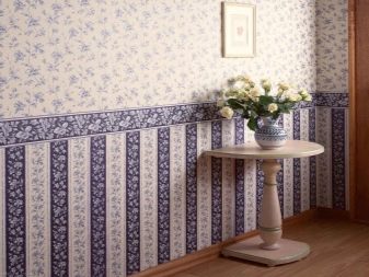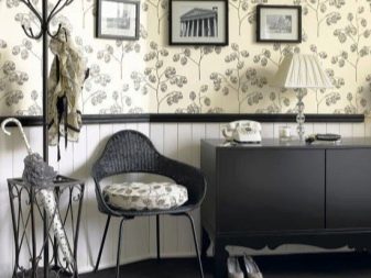 - تقسيم الجدار أفقيا إلى قسمين. هذه الطريقة في زخرفة الجدار نادرة الآن. إنه ينتمي إلى اتجاه التصميم الكلاسيكي وليس مناسبًا جدًا للأنماط الحديثة. ومع ذلك ، فإن تأثير الصلابة والنبل الأنيق ، الذي يمنحه هذا المزيج ، لا يزال له معجبيه. في هذه الحالة ، ينقسم الجدار إلى جزأين: الجزء السفلي يبلغ ارتفاعه حوالي متر واحد من الأرضية ، أما باقي الجدار فينتمي إلى القطاع العلوي. تقليديا ، هناك خلفيات داكنة بدون نقش في الأسفل. الجزء العلوي مزين بلوحة أفتح ، ويمكن أن يكون له نمط أنيق. هذا التوزيع للظلال يجعل الممر أخف وزنا وأكثر كثافة..