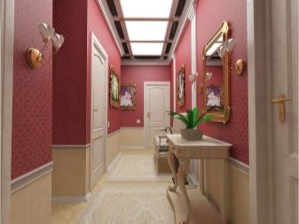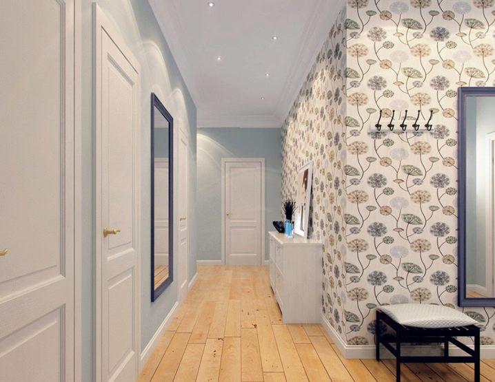 تحتاج الممرات الصغيرة إلى توسع بصري ، لذا فإن مزيجًا من ظلال الضوء (أحادية اللون وأنماط) سيكون خيارًا ممتازًا لممر صغير. البيج والقشدة والأزرق الفاتح والوردي الفاتح وألوان الباستيل الأخرى ستؤدي المهمة بشكل مثالي. الألوان الداكنة والمشرقة جدًا غير مناسبة في هذه الحالة. لن يؤدي ذلك إلا إلى تفاقم الوضع ، وخلق تأثير ازدحام أكبر. إذا كان الردهة فسيحة بدرجة كافية ، فإن خيارات الألوان تقتصر فقط على الذوق الشخصي وأسلوب الغرفة..
