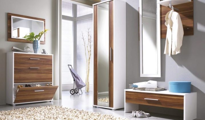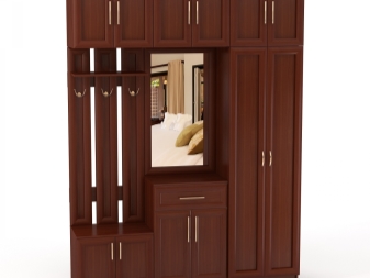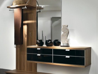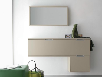 نموذج شائع آخر هو خزانة مع مرآة. يعد هذا خيارًا عمليًا ومريحًا ، حيث يوفر مساحة في الردهة ويسمح لك بالتنظيف بشكل مريح. في أغلب الأحيان ، يتم إرفاق مرآة معلقة بالخزانة ، ولكن يمكن أيضًا أن تكون منتجًا على الأرض..