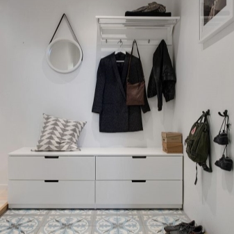 لا غنى عن أحجار الرصيف من أجل تحقيق أقصى استفادة من ممر صغير. إنها تسمح لك بتخزين الملابس والأحذية بسهولة ، وهي أيضًا إضافة ملحوظة للداخل..