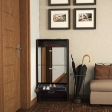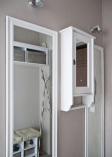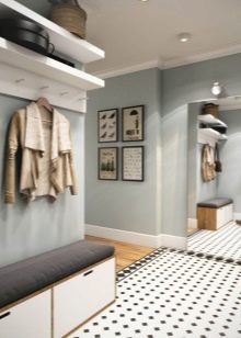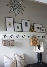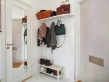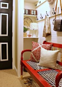 وبالمثل ، عليك أن تتصرف عند تنظيم رواق بعرض 80-90 سم ، والذي يبدو صغيرًا جدًا مقارنة بمنطقة المدخل المدمجة ولكن الواسعة. هنا ، يمكن أن يكون البديل لحالة القلم هو تركيب علاقة أرضية أو علاقة على شكل عارضة مع خطافات أو هيكل على شكل قاعدة ذات ظهر مرتفع للخطافات.