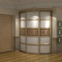 تعد الهندسة المعقدة للغرفة سببًا لاختيار الخزائن الشعاعية. في غرفة ضيقة جدًا ، ستغلق الأبواب المفصلية لنظام التخزين الممر ، لذلك من الأفضل إعطاء الأفضلية لخزانة ملابس بأبواب منزلقة أو نموذج وظيفي مدمج.