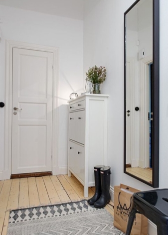 - باللون الأبيض – أحد الحلول الأكثر شيوعًا للأثاث في الردهة ، بفضل تصميم سكاندي الخالد والأسلوب البيئي والبساطة والحداثة.