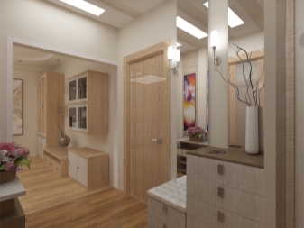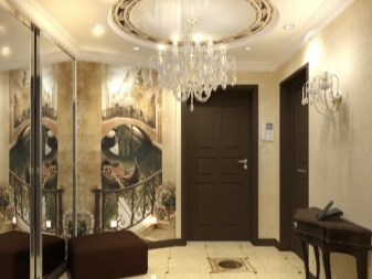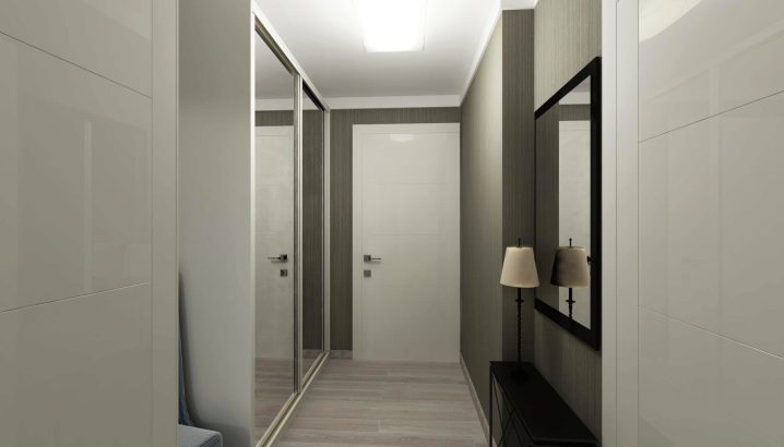 لا تنس أن مثل هذه الممرات لها عناصر زخرفية وإضافية, وجوب مرايا الأبواب. يعطي التزجيج مزايا معينة: التوسع البصري للداخل ، انعكاس التدفق الضوئي ، بالإضافة إلى القدرة على النظر إلى نفسك دون مغادرة الخزانة.