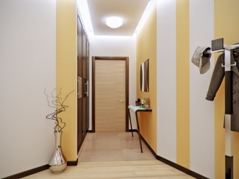 في أغلب الأحيان ، في الشقق النموذجية ، يكون الممر عبارة عن غرفة ضيقة وصغيرة ، لذلك يجب فصلها بصريًا باستخدام الاختيار الصحيح للألوان. بالنسبة للممر ، يُنصح باختيار طلاء أو ورق حائط من الظل الفاتح.. يمكنك توسيع حدود الردهة بصريًا باستخدام نمط ممدود خاص.. يمكن استخدام اللون الغامق للجدران في تصميم الممر ، لكن يجب وضع الإضاءة بشكل صحيح..