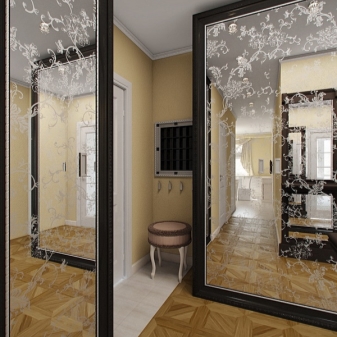 في كثير من الأحيان ، يتم تثبيت خزائن منزلقة بأبواب عاكسة في الردهة ، وهي عملية للغاية وجميلة للغاية. في صالونات الأثاث ، يمكنك تقديم مثل هذه الخدمة مثل الرسومات على المرايا. بناءً على طلبك ، يمكن تطبيق إحدى الرسومات على مرآة خزانة ملابسك..