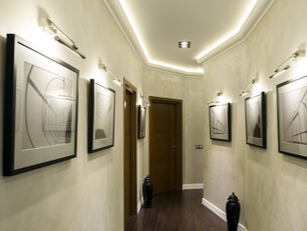 بالإضافة إلى ذلك ، هناك أضواء كاشفة متنقلة يمكن ، بناءً على طلب المستخدم ، نقلها على طول الحافلات الموصلة. في هذه الحالة ، يمكن أن تكون الإطارات على شكل خيوط ممتدة في الغرفة ، أو في شكل أسلاك صلبة. وبالطبع ، لا تزال ثريات السقف التقليدية تحظى بشعبية كبيرة. في الردهة ، على عكس جميع الغرف الأخرى, يجب أن يكون الضوء العام ناعمًا ومنتشرًا, لذلك ، في مثل هذه الغرفة يجب ألا تكون هناك مصادر إضاءة مفتوحة – المصابيح مغطاة بظلال أو أباجورة ، يمر من خلالها ضوء خافت ، مريح للعينين.