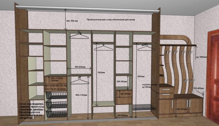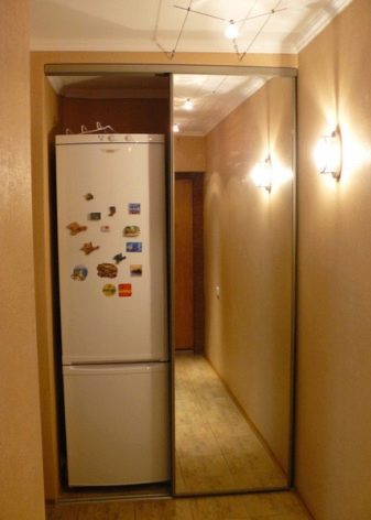 بالإضافة إلى ذلك ، في الردهة ، يمكنك وضع العديد من المخزون والأدوات وطاولة الكي وحتى الثلاجة والغسالة. يمكن وضع لوح الكي والمكنسة الكهربائية في أقسام مخصصة أو ببساطة في الجزء السفلي من الخزانة.