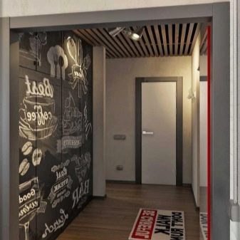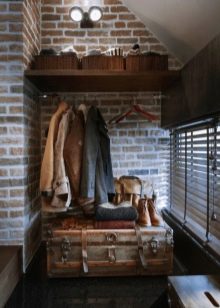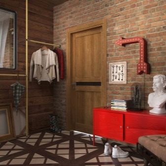 - نقطة مهمة هي الملحقات في الردهة. يتم اختيارها بعناية وتشبه القمامة التي ألقى بها شخص ما بعيدًا. الغرض الرئيسي من عناصر التصميم هو التذكير بأن النمط له خلفية صناعية. ستتم الإشارة إلى ذلك من خلال الأسهم التي تشير إلى الاتجاه إلى الغرف ، والنقش “أدخل” أو “الخروج” ، وعلامات الطريق ، ومصابيح الطوارئ.