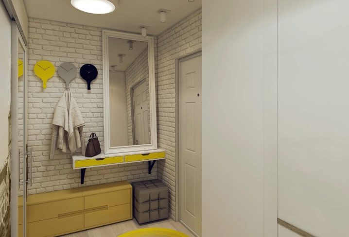 عكس التصميم الأول هو مدخل خفيف مصنوع من درجات اللون البيج. للراحة ، تم تركيب خزانة ملابس مدمجة مع مرايا على الأبواب. ساعة مقتضبة ، طاولة ذات شكل مثير للاهتمام ، سقف معلق مع مصابيح مدمجة تجذب الانتباه. تعرض هذه الملحقات ميزات عالية التقنية.