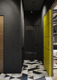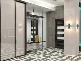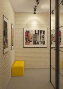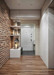 عكس التصميم الأول هو مدخل خفيف مصنوع من درجات اللون البيج. للراحة ، تم تركيب خزانة ملابس مدمجة مع مرايا على الأبواب. ساعة مقتضبة ، طاولة ذات شكل مثير للاهتمام ، سقف معلق مع مصابيح مدمجة تجذب الانتباه. تعرض هذه الملحقات ميزات عالية التقنية.