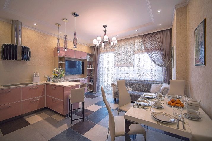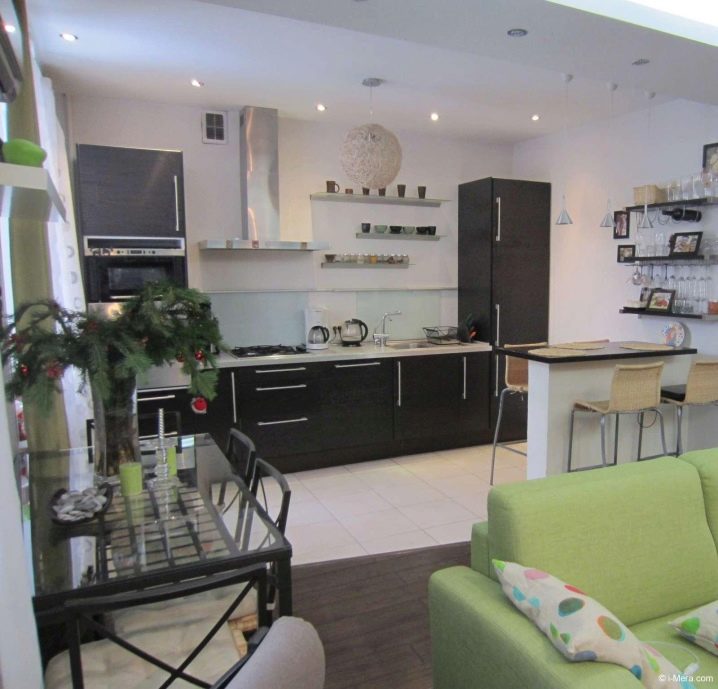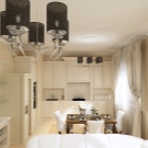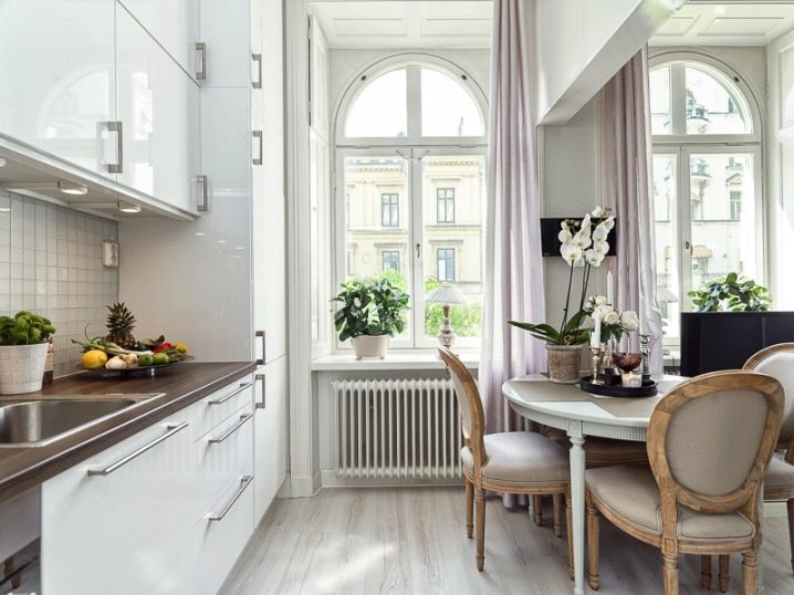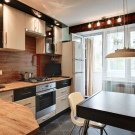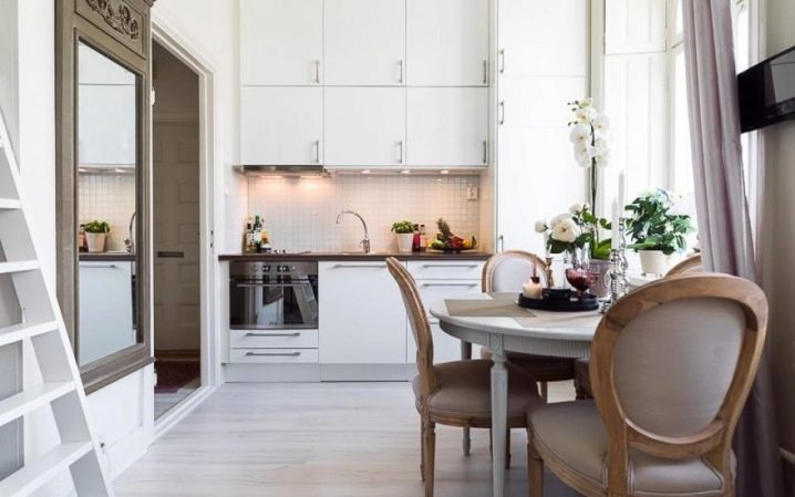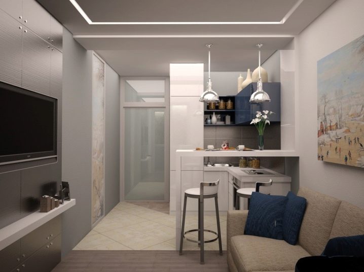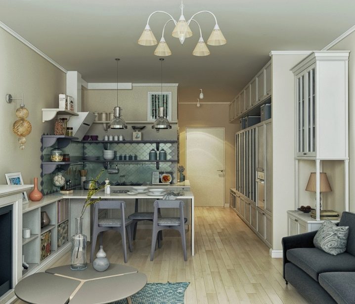 تم توسيع المطبخ من خلال الرواق. تجمع وحدة المطبخ كاملة الحجم بين التخزين والأجهزة المنزلية. لتزيين الأرفف ، يتم استخدام المواد الخشبية ، كما يتم وضع أدوات المائدة والإكسسوارات المختلفة فيها. اتضح غرفة معيشة مطبخ صغيرة.