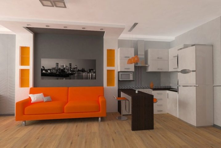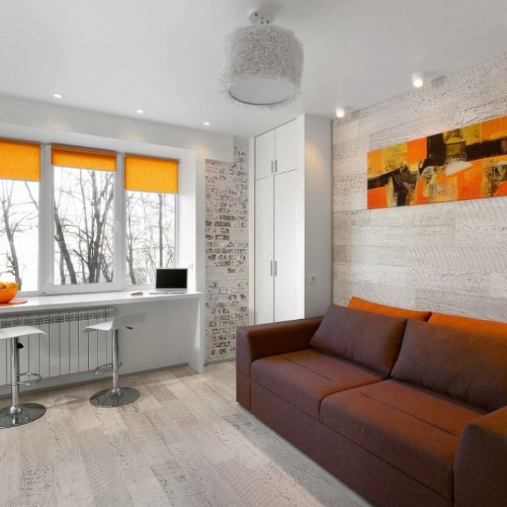 لا تنس أنه في مثل هذه الشقة لن يكون من الضروري تركيب التهوية أو تكييف الهواء. يوصى باستخدام أريكة على شكل أكورديون وكرسي – سرير كأثاث للنوم واستقبال الضيوف..