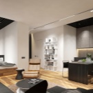 من أجل وضع منهجي للأدوات المنزلية في الشقة ، يتم التفكير في الرفوف المفتوحة. من أجل جعل المساحة تبدو جديدة وإيجابية ، قرر المصممون ترك الجدران بيضاء..