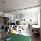 اتضح أن المطبخ مضغوط جدًا ولكنه حديث ؛ تم نقل غسالة كانت بالقرب من الحمام إلى هذا الجزء من الشقة. توجد أريكة صغيرة بجوار ركن طهي هادئ. الأثاث له وظيفتان – إنه مكان للاسترخاء والعشاء في نفس الوقت..