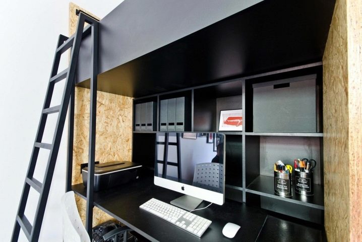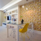 منطقة العمل تتم في المنطقة المجاورة مباشرة لغرفة المعيشة. ثم يمكن أن تكون أقسام الحوائط الجافة شائعة وتعمل كمكتبة ورفوف لوثائق العمل. بمساعدة مثل هذا الحل ، يمكنك توزيع جزء من مساحة الشقة بشكل صحيح. في منطقة العمل ، يكفي وضع طاولة مضغوطة يوجد عليها جهاز كمبيوتر أو كمبيوتر محمول. لكن لا يزال هذا المكان يتطلب مقاربة فردية حسب نوع النشاط..