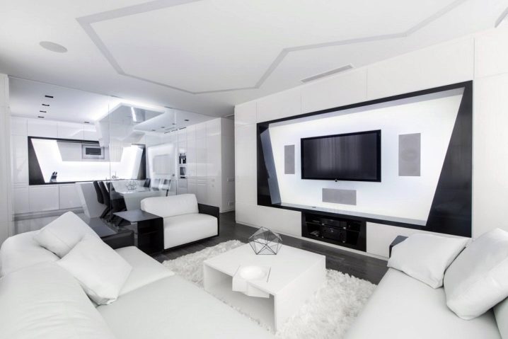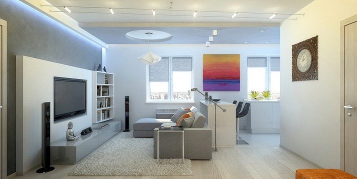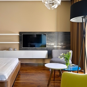 تم تركيب تلفزيون بلوري سائل أو تلفزيون بلازما على الحائط ، حيث يمكنك تحته إصلاح الخزائن الضيقة والمريحة للأشياء أو الأرفف المفتوحة للكتب أو الأشياء الصغيرة للديكور. غالبًا ما تكون الثريا في هذا المكان متصلة بالسقف. ولكن إذا كانت الشقة تحتوي على سقوف متوترة ، فيمكن توزيع المصابيح المدمجة فيها مع مراعاة الأماكن التي تشتد فيها الحاجة إلى الإضاءة الاصطناعية.