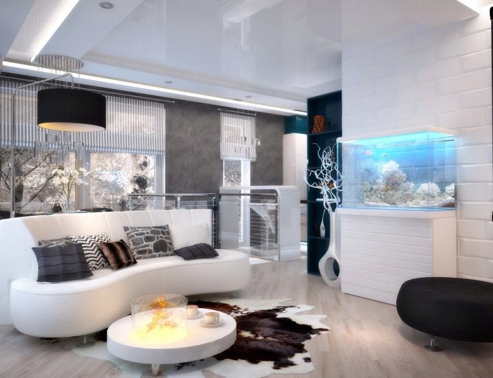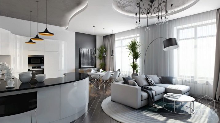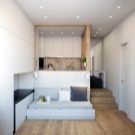 يمكن تجهيز قسم من شقة استوديو بمساحة مقسمة بمنصة مصنوعة من اللوح الجصي أو الخشب الرقائقي أو مواد أخرى مناسبة. تم تركيب تلفزيون أو أريكة قابلة للطي عليه ، والتي لا يمكن أن تصبح فقط قطعة أثاث يجلس فيها الضيوف ، ولكن أيضًا مكان للنوم. المنطقة المركزية مخصصة لغرفة المعيشة في شقة الاستوديو. لن يكون من الصعب تأثيثها بأثاث متحرك ومريح..