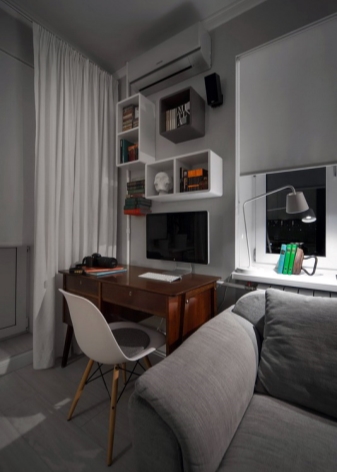 إذا كان عليك غالبًا أن تأخذ العمل إلى المنزل ، وكان ذلك مرتبطًا بقضاء الوقت على جهاز كمبيوتر أو كمبيوتر محمول ، فستحتاج إلى منطقة عمل. في أغلب الأحيان ، يتم تنظيمه بالقرب من النافذة ، بحيث يكون هناك الكثير من الضوء الطبيعي. يمكن أن ينقذ دريوال مرة أخرى ، حيث يمكنك إنشاء قسم صغير لمنطقة العمل من المنطقة الرئيسية للشقة. غالبًا ما يتم ترتيبها على شكل رفوف. إنها مريحة وأنيقة – لن تكون الرفوف بمثابة زخرفة زخرفية فحسب ، بل ستكون أيضًا أرفف ملائمة للأوراق ووثائق العمل.